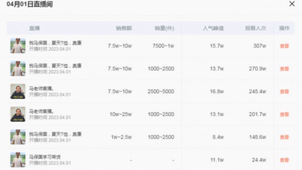 不过,马保国可能也没料到,自己会“逗你”反被“逗你”误。4月1日一共6场直播,总场观人次破千万,峰值达到20万人次,但销售额只有41万元,算下来佣金还不到5万元。
