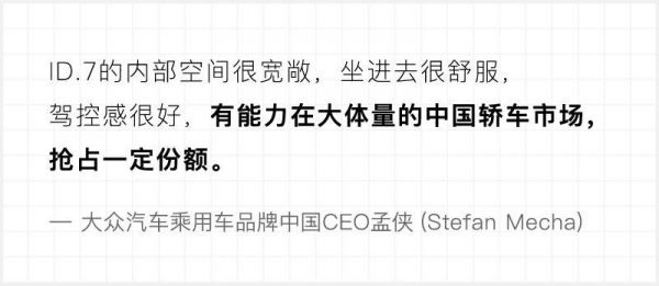在大众汽车乘用车品牌中国CEO孟侠(Stefan Mecha)看来,作为ID.家族的第一款轿车,ID.7 VIZZION上有很多创新,除了前述先进科技外,ID.7 VIZZION的内部空间很宽敞,坐进去很舒服,驾控感很好,有能力在大体量的中国轿车市场,抢占一定份额。