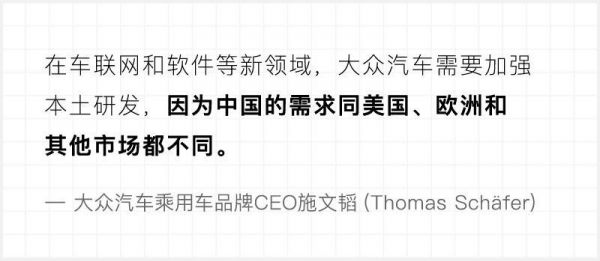 施文韬认为,在车联网和软件等新领域,大众汽车需要加强本土研发,因为中国的需求同美国、欧洲和其他市场都不同。因此,必须要在当地市场才能开发出符合当地需求的功能。