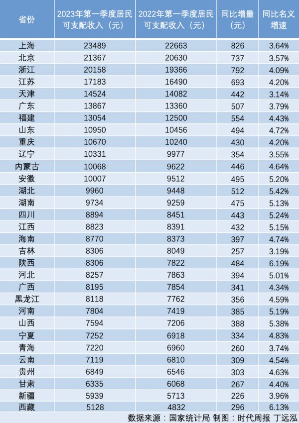 与此同时,宁夏也凭借4.83%的名义增速超过青海。各地的居民可支配收入,究竟在一季度发生了怎样的变化?