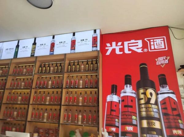 这家名为福来的超市,门头很红火,光良酒硕大的文字和图片也暴露了这是一家被光瓶酒品牌光良“包养”了的超市。走进去,果然看到四面墙上的立式酒柜上都是光良酒,从19-59PLUS都有,每瓶的价格从20多元到上百元不等。