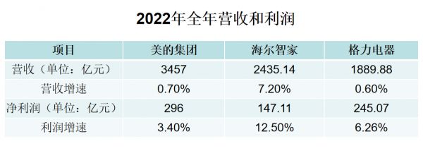 从以上的数据中能发现,尽管2022年对于许多行业而言都是寒冬,也有大量企业在不停的裁员,但国内家电三巨头却依旧保持稳定的发展局势,在逆境中获得一定的增长,这一点是很难能可贵的,说明公司在应对风险方面还是做了很多准备。当然,三者表现不同但各有亮点,不论是增长最高还是盈利最大,说明三巨头有自己鲜明的优势,对后续的发展有很大帮助。