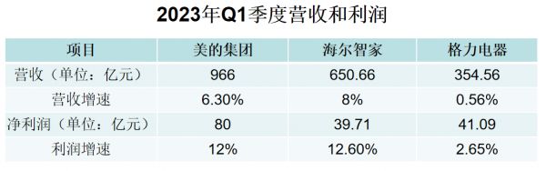 (雷科技制作 严禁侵权)我们再来看看,顶住压力的三巨头在今年疫情放开后的经营情况会发生什么变化。2023年Q1季度财报数据显示,美的集团营收966亿元,同比增长6.3%;净利润80亿元,同比增长12%。海尔智家营收650.66亿元,同比增长8%;净利润39.71亿元,同比增长12.6%。格力电器营收354.56亿元,同比增长0.56%;净利润41.09亿元,同比增长2.65%。