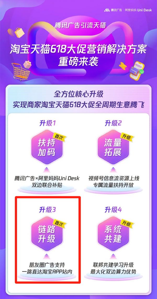 第一,今年618期间,腾讯广告与阿里妈妈Uni Desk首次实现双边联合补贴,助力商家GMV稳步增长;