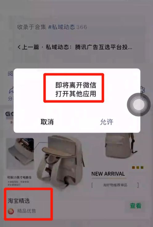 第二,在具体的带货链路上,微信开放了朋友圈,实现了朋友圈广告一跳直达淘宝APP站。