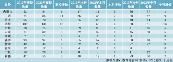 在西部地区,从2017年至2022年,四川是新增高校数量最多的省份,新增本科院校2所,专科院校23所。
