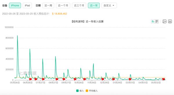 《哈利波特:魔法觉醒》国内iPhone端收入预估趋势。来源 / 七麦数据