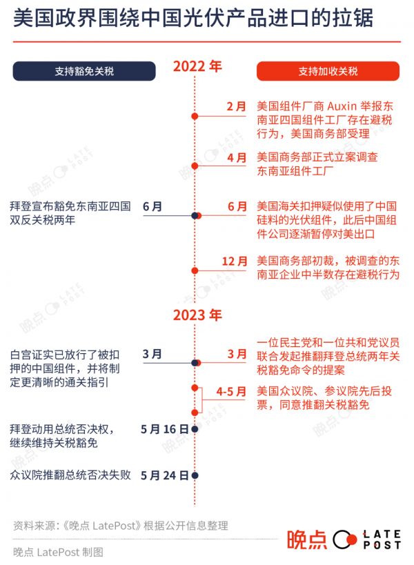 去年 4 月,美国商务部开始调查在东南亚的中国光伏工厂,拜登随即宣布豁免双反惩罚性关税两年。美国国会组织反击,参众两院在今年 4~5 月以多数票推翻拜登的豁免令。佛罗里达州共和党参议员马尔科·卢比奥表示,“如果总统关心美国的就业、环境、劳工权益”,就该同意征收关税。参众两院 20 多位民主党议员也投票反对同为民主党的拜登。