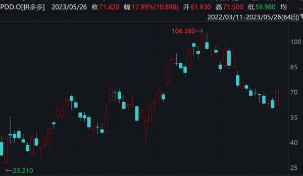在过去一年中,拼多多股价最高曾至106美元/股,在财报利好刺激下,周五拼多多股价大涨19%,收于71.42美元/股,其市值也增至949亿美元,再次和京东拉开距离。