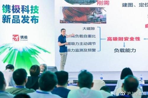 上海交通大学机器人研究所副所长、镌极科技联合创始人赵言正发布新品永磁吸附爬壁机器人。赵言正教授介绍到,镌极爬壁机器人采用绿的谐波生态链企业自主研发的关键零部件实现了技术突破,能够实现如攀爬内外折角、跨越障碍物等高难度地形跨越动作,具有不同复杂曲面地形适应能力,还能够实现多传感器融合下的复杂场景实时建图、定位、路径规划及自主决策。同时,镌极爬壁机器人借助力磁耦合设计及控制算法,整机维持极高综合负载能力条件下能耗最优,实现了机器人在高空作业的高移动能力、高适应能力、高通过能力、高负载能力,未来有望切入罐体、船舶等行业的焊接、涂装、打磨、检测等全新领域。