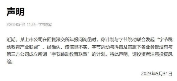 关注函指出,5月31日公告中所称“正在设计筹划当中”事项的具体情况,与对方声明中“没有与第三方公司成立所谓‘字节跳动教育联盟’的计划”是否存在矛盾,公司在该公告中信息披露是否存在误导性陈述。