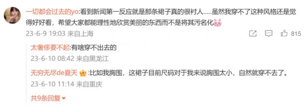 一开始有人说女主的连衣裙是价值9W的高定奢品,后来有人说这是淘宝设计师原创只要500多,然后又有人说500多的肯定是仿款打版……
