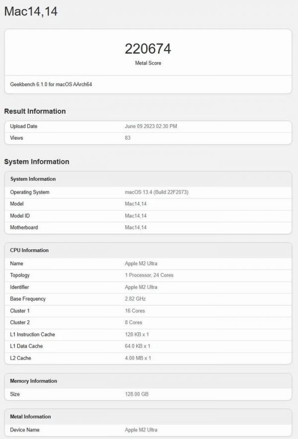 苹果 M2 Ultra 芯片现身 Geekbench 数据库,频率 3.68 GHz