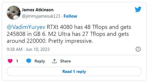 苹果 M2 Ultra 芯片 Geekbench 6 Metal 跑分出炉,仅比 RTX 4080 慢 10%