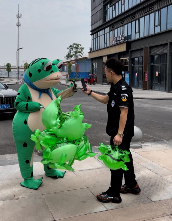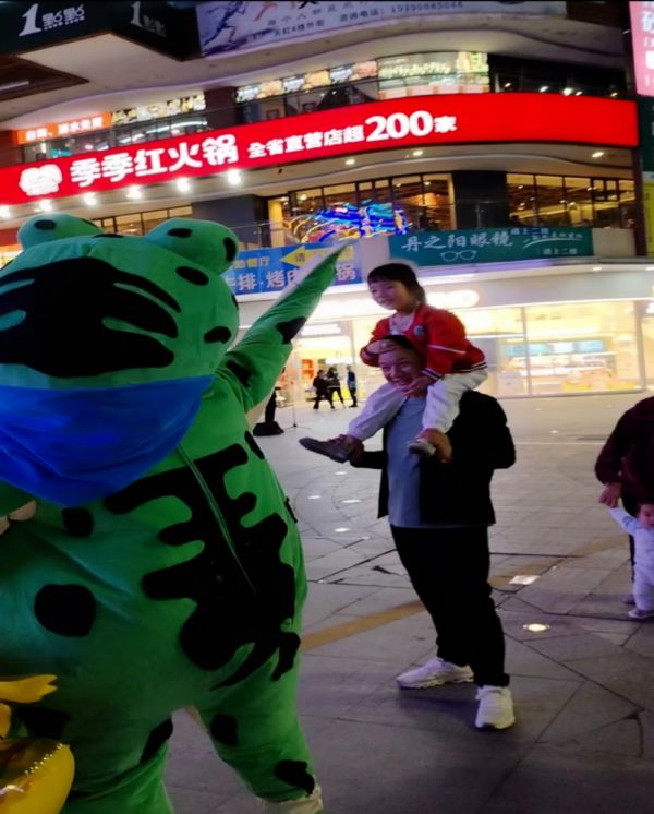但躲在蛙服里就很安全。经常会有人来跟我互动,主动给我拍照,关心我会不会很热。每个人都有面具,但有时我觉得穿上蛙服,披上这层面具,我才是真正的自己。我很享受这件事,家人和同事问我在干嘛,我都会说,我在兼职卖崽,贩卖人间快乐。
