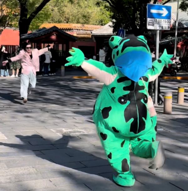 那天,我穿着蛙服走了一下午,朋友随手帮我拍了点视频,我剪了一下,发到网上去,突然收到很多反响,我就想着利用五一假期再穿一次,于是我又穿着蛙服,跟朋友一起去了一趟颐和园。