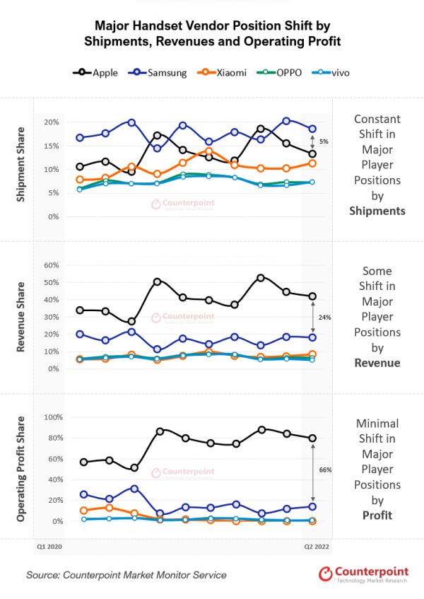 苹果作为行业大哥,安卓阵营与其竞争的机型销量都在它面前落了下风;而如果苹果将价格下压,就会压缩安卓手机品牌的上限价格。