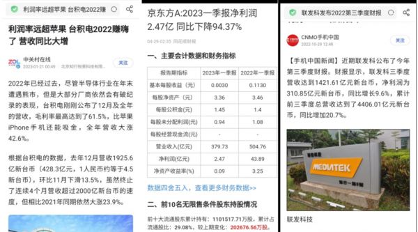首先是硬件成本,CPU、屏幕、摄像头这些元器件,我们接下来看几组手机元器件厂商的利润: