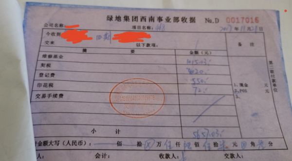 张婷婷向记者展示的收据显示,在这两张抬头为“绿地西南事业部”、收费时间为2017年11月18日的收据里,这近6000元的费用包含了维修基金1015元、税费4020元、登记费550元、印花税72元、产权代办费300元。