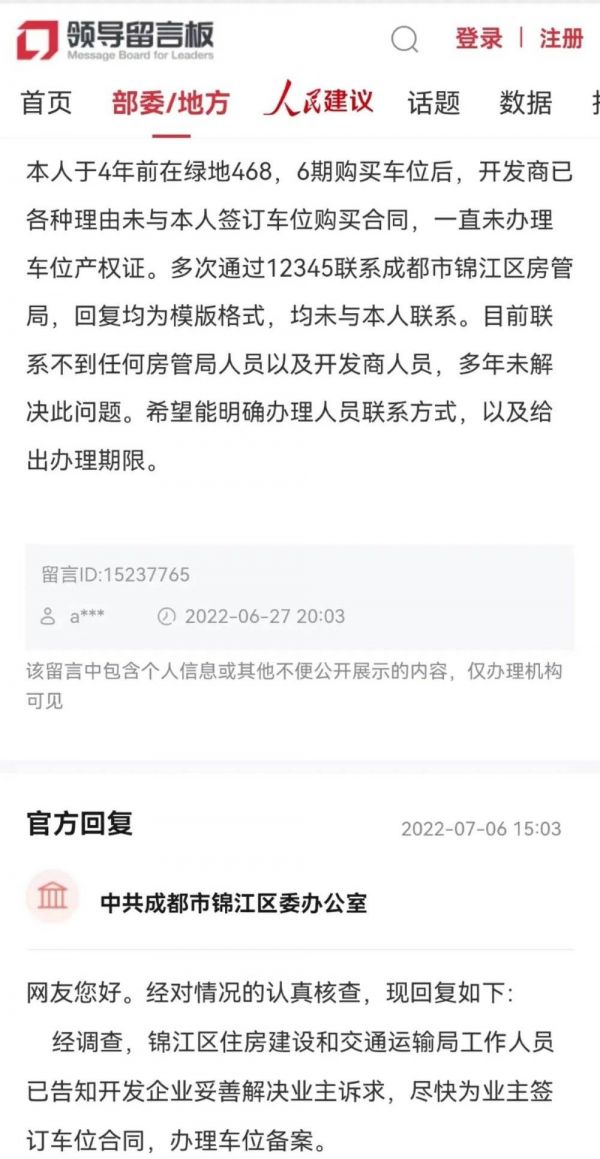 事实上,存在这一问题的并非仅张婷婷所在的项目4期小区,同为绿地468项目的3期、5期、6期等均存在。在人民网领导留言板、问政四川等平台上,从去年开始就有不少业主投诉绿地车位产权证因为税费问题无法办理。
