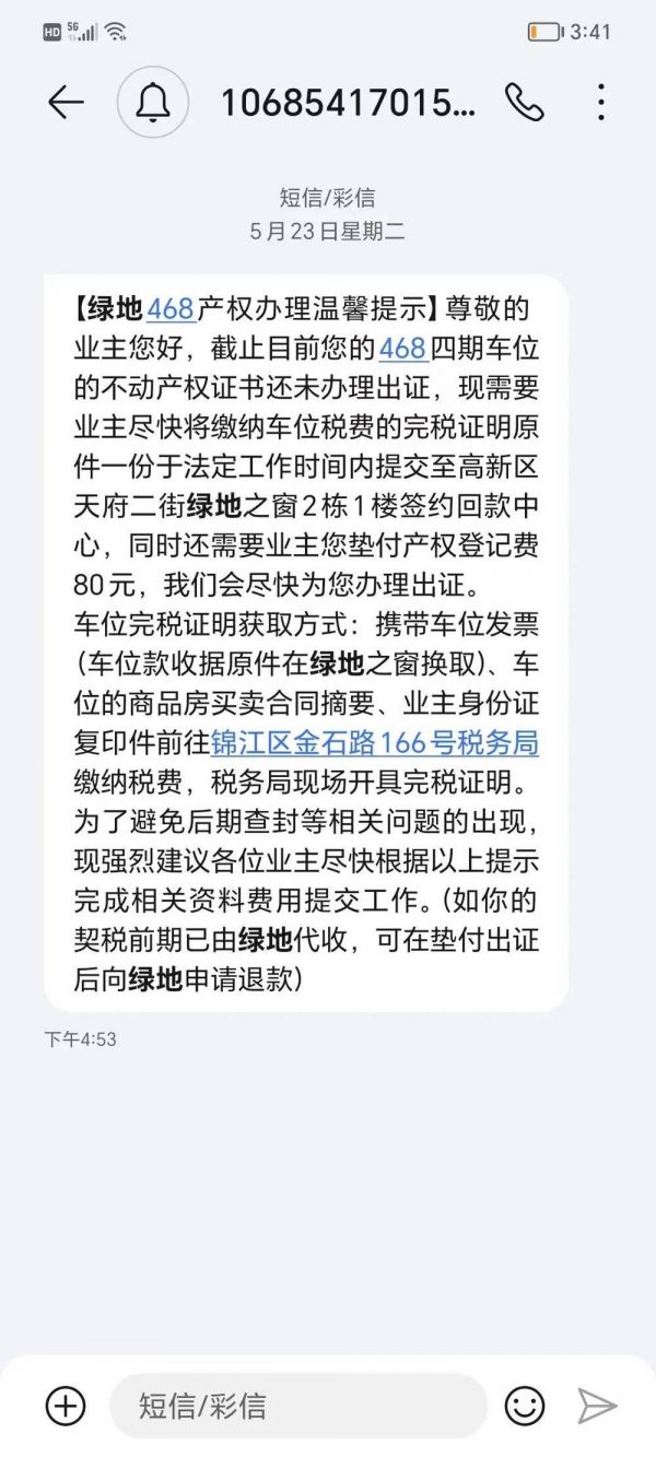 然而,让张婷婷没想到的是两年多过去了,她和另外900多户业主没有等来产权证,反而等来了一则催收通知短信,明确办理车位产权证需要业主提供缴纳车位税费的完税证明和相关资料办理,但“契税前期已由绿地代收,需要垫付出证后向绿地申请退款。”