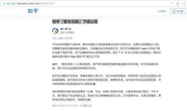 知乎将下线匿名功能