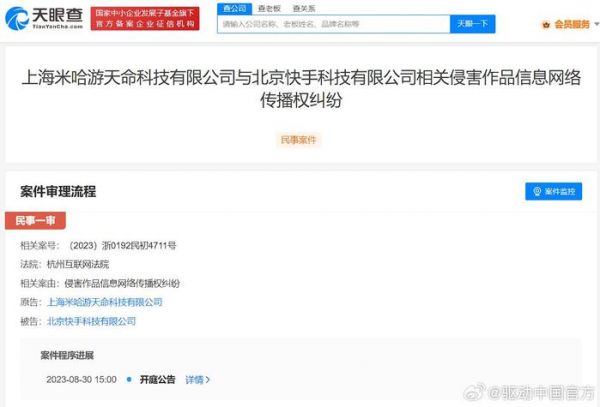 7月11日消息,天眼查App显示,近日,上海米哈游天命科技有限公司新增一则开庭公告,被告为北京快手科技有限公司,案由为侵害作品信息网络传播权纠纷,该案将于8月30日在杭州互联网法院开庭审理。