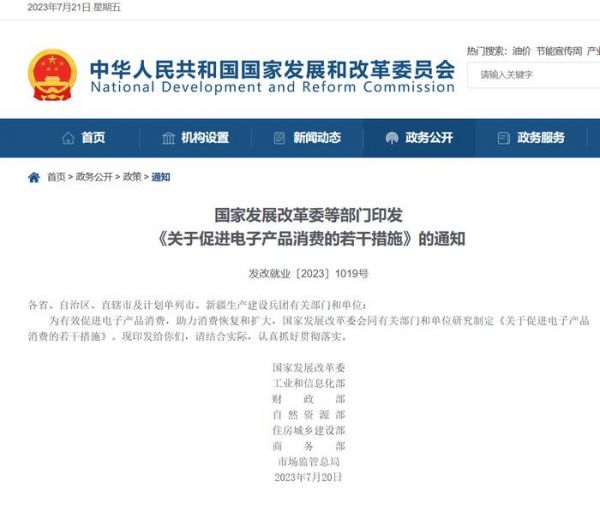 IT之家 7 月 21 日消息,国家发展改革委等部门日前印发了《关于促进电子产品消费的若干措施》的通知,目的是有效促进电子产品消费,助力消费恢复和扩大。