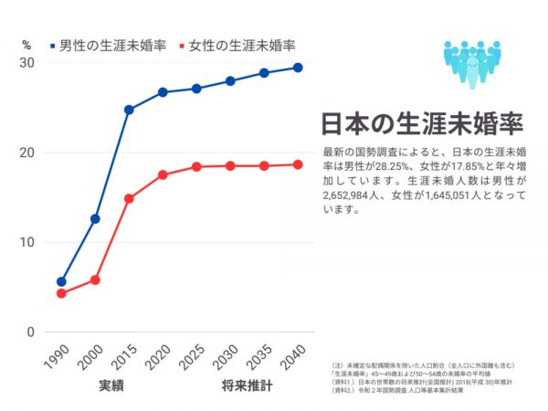 日本一生未婚的男性人数预计在2040年会达到近30%