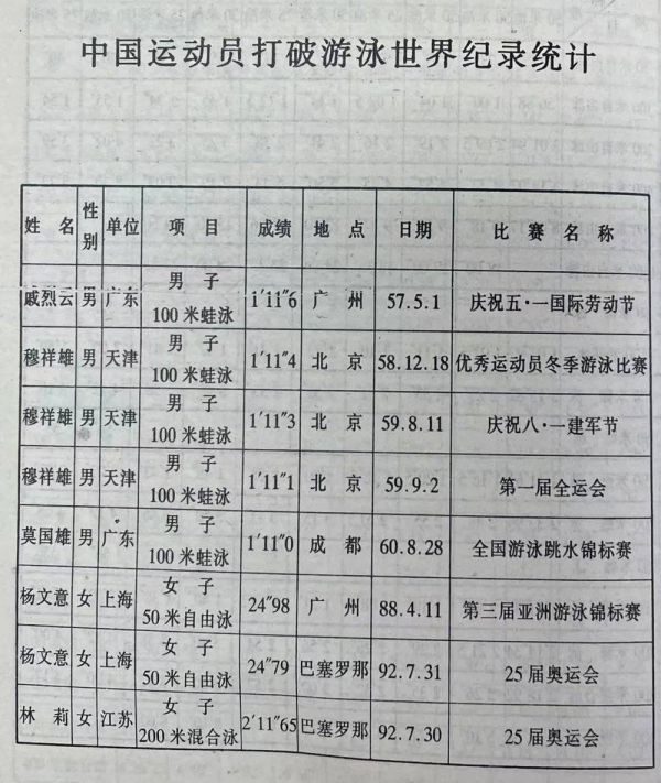▎书籍《中国游泳运动史》里的资料记录了中国男子蛙泳曾经的世界纪录。