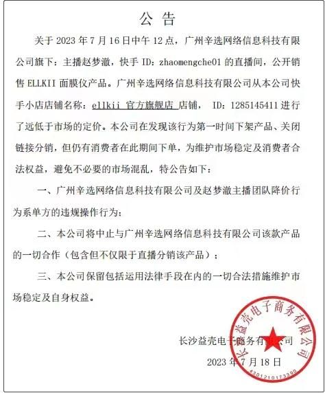 7月18日,美容仪品牌ellkii在官方账号发声明称要和辛选团队停止合作。