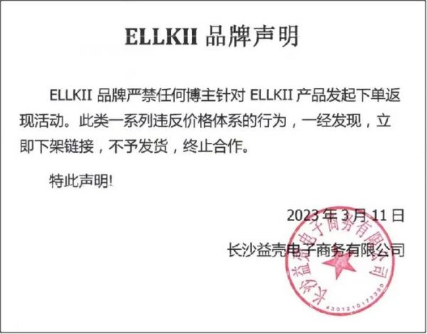 并且,今年3月ellkii品牌曾发声明表示,严禁任何博主针对品牌产品发起下单返现活动,一旦发现违反价格体系的行为,立即下架链接,“不予发货,终止合作”。