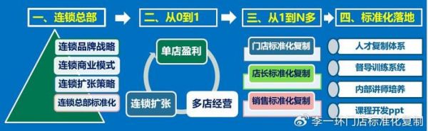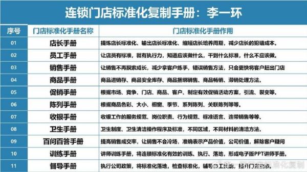 李一环认为连锁企业每一位管理者,都要懂门店标准化复制,同时连锁品牌更应该建立:连锁门店运营管理手册,门店标准化复制,店长标准化复制,门店销售标准化手册,门店销售话术手册,门店百问百答话术,标杆销售经验萃取复制,督导标准化体系,以及连锁总部门店人才训练体系。