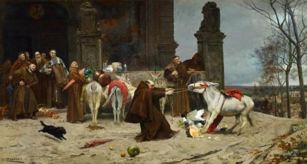 《重返修道院》(Return to the Convent),1868年,爱德华多·萨马科因斯·萨瓦拉(Eduardo Zamacois Zabala)。画面中一群僧侣在取笑一位正在和驴搏斗的僧侣。© Wikipedia