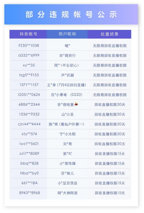 8月1日消息,近日,抖音直播发布第二十期“不良直播PK内容”治理公示。公示显示,2023年7月1日以来,抖音直播已对存在违规的110991个账号进行处罚,并无限期回收1059个账号直播权限。其中,不乏超百万粉丝的主播账号。