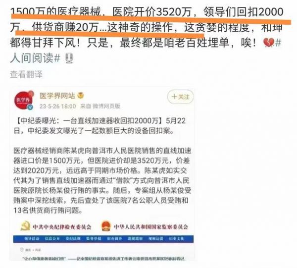 近日有媒体曝光,一台价值1500万的医疗设备,卖出了3520万的咋人天价,经销商赚20万!院长及管事的就敢吃回扣2000万!你没看错一笔交易就敢吃回扣2000万,这哪是吃回扣,抢银行都抢不了这么多钱,都说医疗采购是雁过拔毛,这是直接薅秃噜皮了。听着像笑话,却实际存在,动不动就千万,怪不得老百姓看病难看病贵。