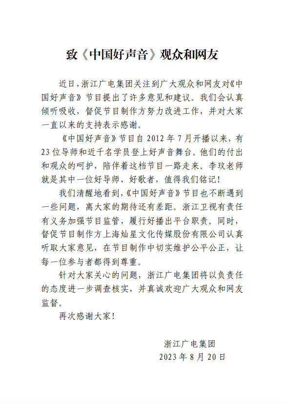 2. 浙江广电当晚发布声明,称将监督、调查核实《中国好声音》被批评的相关问题。