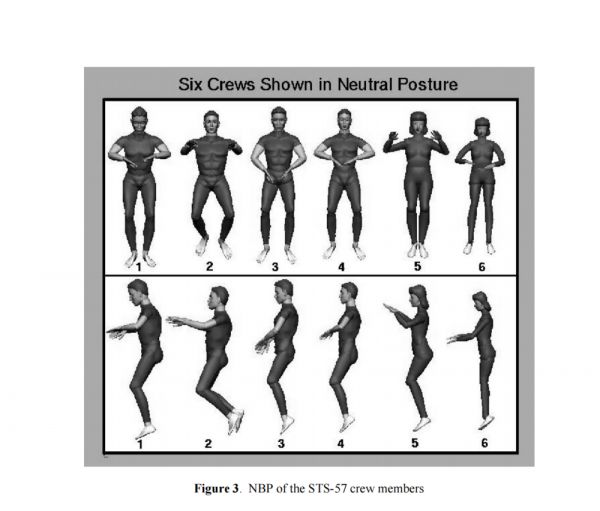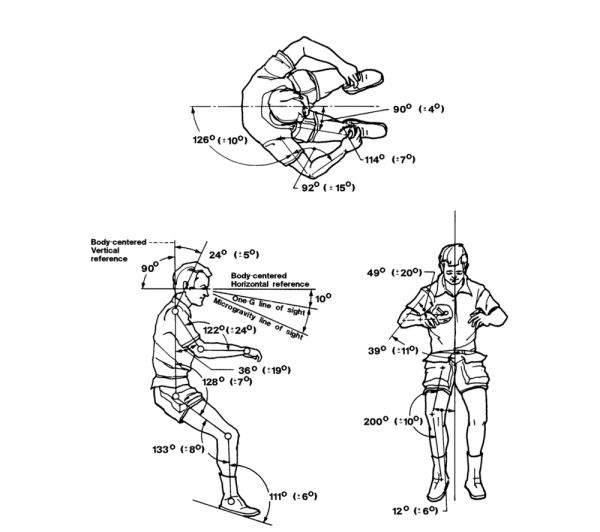 1980年代,美国航空航天局在第一个空间站 Skylab 上,拍摄了 12 名宇航员在太空微重力条件下完全放松身体时的照片。经过研究发现,在这样的重力条件下,身体会自动进入特定姿态,即中立体态(Neutral Body Posture,NBP)。