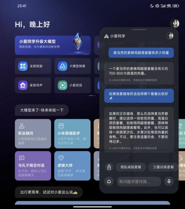 图源:小爱同学 截图对于饮食,小爱同学也有自己的理解。比如正在健身的小伙伴可以问麦当劳套餐的热量,小爱还可以给出哪些套餐更加健康,更适合健身人群。