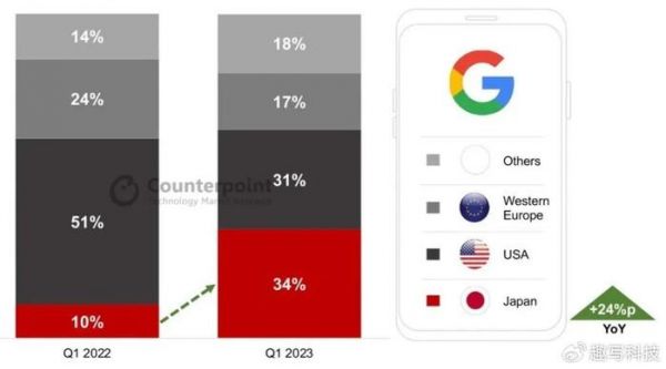 所以,配合上面的本土化营销,Pixel在日本的销量可谓是节节攀升,两年的时间直接翻了3倍,并且Pixel看起来增长势头不减,应该很快就会威胁到苹果iPhone在高端手机市场的地位了。