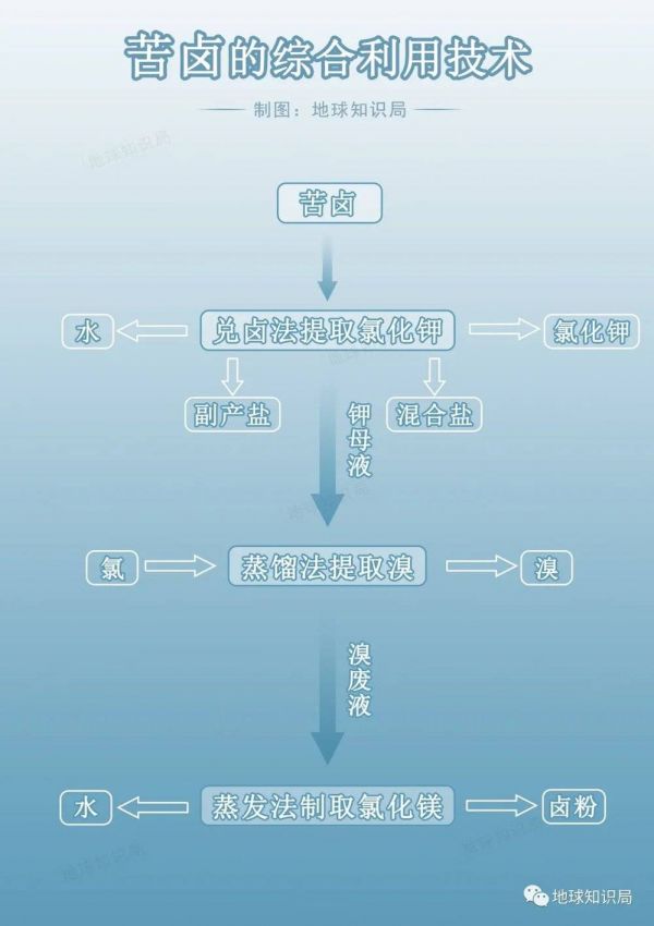 其中,工业用盐多是用海盐和湖盐制成。我国海水苦卤的综合利用是围绕着溴和钾开展的,通常的做法是先制钾,然后用蒸馏法提溴。制钾、溴后的老卤进一步蒸发浓缩可得氯化镁。