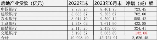 数据显示,截至6月末,六大行投向房地产业的公司类贷款余额达4.3万亿元,较上年末增长约2600亿元;六大行个人住房抵押贷款余额为26.2万亿元,较上年末下降超2000亿元。