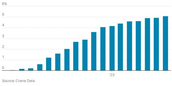 克兰说:“5%是一个有魔力的数字,从心理角度来说是一个很重要的数字,当收益率达到5%时,资金开始涌入货币市场基金,90年代末和21世纪初出现过这种情况,目前正在发生的也是这种情况。”