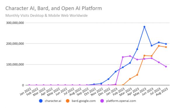 Character AI、Bard、OpenAI 平台在全球桌面和移动网站按月访问量统计