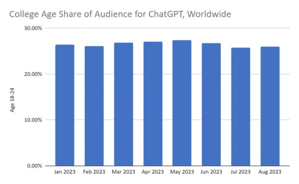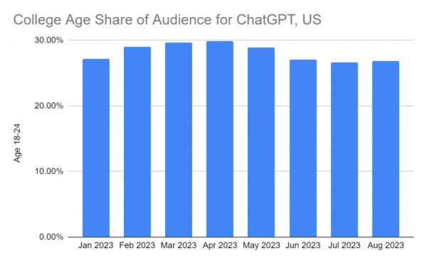据 Similarweb 分析,ChatGPT 夏季流量下降的原因之一是学校放假,在这过程中,损失了大量的学生用户。这也解释了为什么 8 月的流量较为稳定,因为美国学生大部分在 8 月底返校。据估计,chat.openai.com 在美国的访问量仅上升了一个百分点,但在全球范围仍下降了 3%。