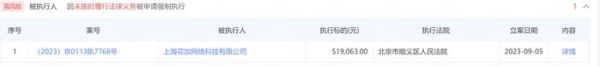 企查查资料显示,花加的主体公司上海花加网络科技有限公司在今年9月5日被申请强制执行,已成被执行人,执行金额约52万元,执行法院为北京市顺义区人民法院。