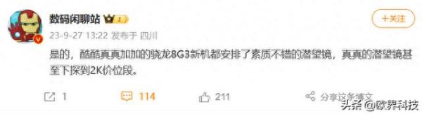 今日@数码闲聊站又带来了智能手机市场内卷无尽头系列的消息之一。博主表示:酷酷真真加加的骁龙8G3新机都安排了素质不错的潜望镜,真真的潜望镜甚至下探到2K价位段。