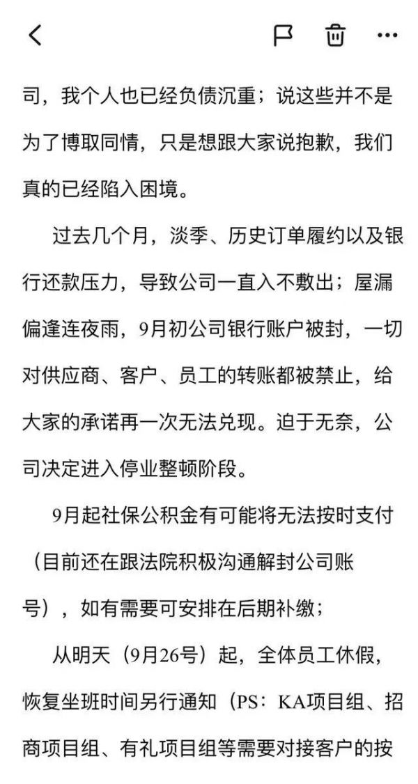 全员信承认了公司遭遇“前所未有的压力”,并表示“过去几个月,淡季、历史订单履约以及银行还款压力,导致公司一直入不敷出”。而9月初公司银行账户被封,对于供应商、客户和员工的转账都被禁止,花加决定进入停业整顿阶段。