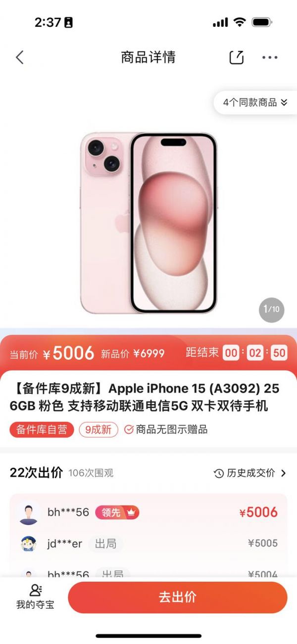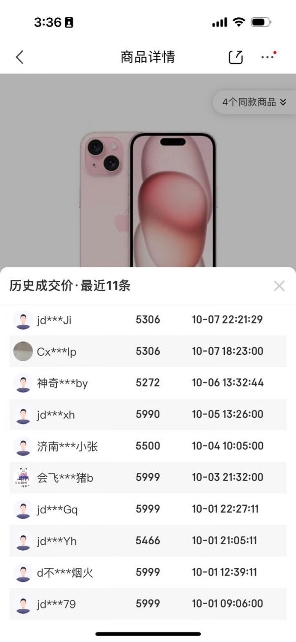 图片来源:雷科技为了不事先推高产品报价,有经验的夺宝岛玩家会参考产品的售价与历史报价,卡着销售时间结束的最后几秒开出自己的真实报价。同样以iPhone 15为例,尽管一开始抬价阶段大家看起来像是捡了大便宜,但翻查产品历史成交价格,原价5999元的iPhone 15最终5600元左右的价位成交,十次成交的中位价格为5745元。