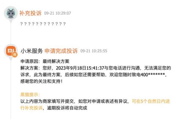 暂且不论小米的产品质量是否存在问题,在这一起投诉案例,小米方面给出的最终解决方案回复是:“您好,2023年9月18日15:41:37与您电话进行沟通,无法满足您的诉求,此为最终方案,后续如您还需要帮助,欢迎您随时致电400*******,感谢您的关注和支持!”面对“最终解决方案”,只剩下消费者原地一脸问号。